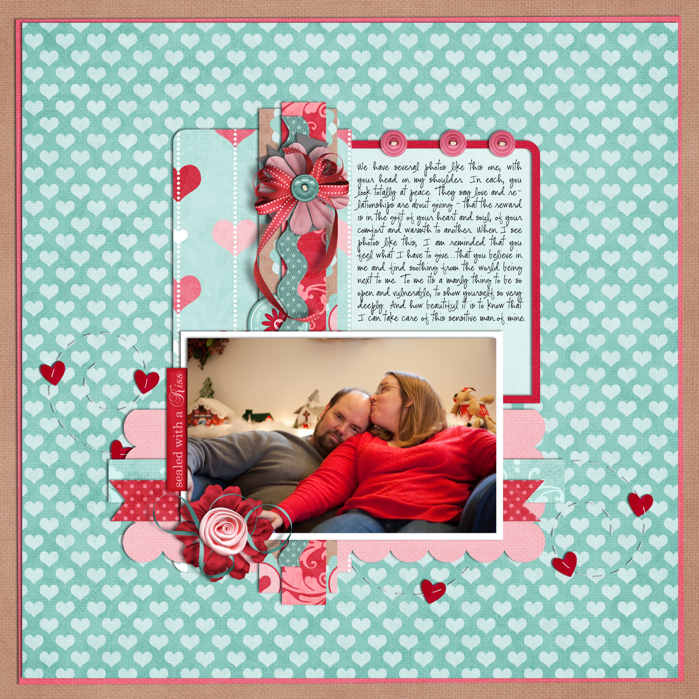 Before creating this layout, I used mind mapping to explore and understand feelings related to my husband, our relationship and how it has evolved. What came out was a wonderful story about the strength of support and genuine trust we have for one another.