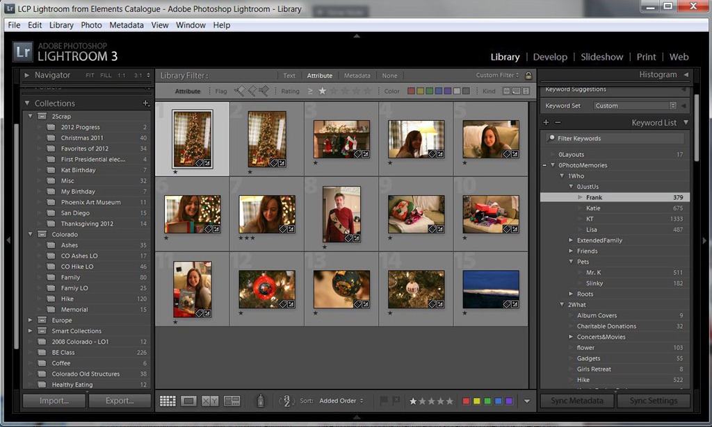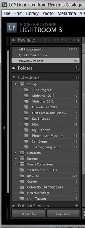 In Lightroom, I can actually create sub-collections under 2scrap. I like to do this to help me remember specific layout ideas that I want to scrap. As I import my photos, I star my favorites and place them in one of my 2scrap collections. As you can see, I still have items collected for Christmas 2011 and few other things in my 2scrap collection. When I have some time available for scrapping, I have photos already sorted and ready for me!
