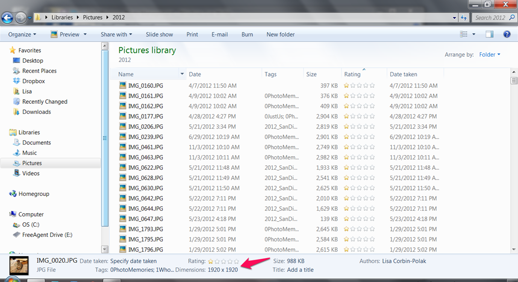 First, you need to get your photos downloaded off of your camera(s), yes all of them, including your phone and onto your computer. You can do this daily, weekly, bi-weekly, or monthly; whatever works best for you. I have mine set up to download to a folder in the My Pictures directory by year. So, all of my photos from 2012 are in the My Pictures\2012 folder. I might make exceptions if there is some big event where I have several hundred photos. (Click on the images if you’d like to see them larger.)